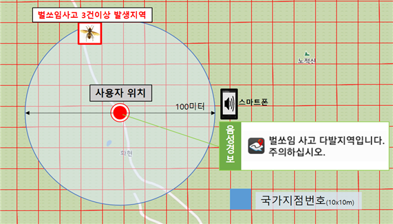 사용자는 휴대폰 경고 메시지가 울리면, 벌쏘임 다발지역 위치를 확인하고 주변에 벌이나 벌집이 없는지 살펴야 한다.