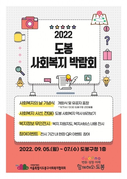 5일부터 3일간 도봉구청 1층 로비에서는 도봉구 복지정보 무인 전시 사회복지 시선, 展 박람회 참여 이벤트가 열리고 9월 7일에는 사회복지의 날 기념식과 사회복지유공자 표창이 진행된다.