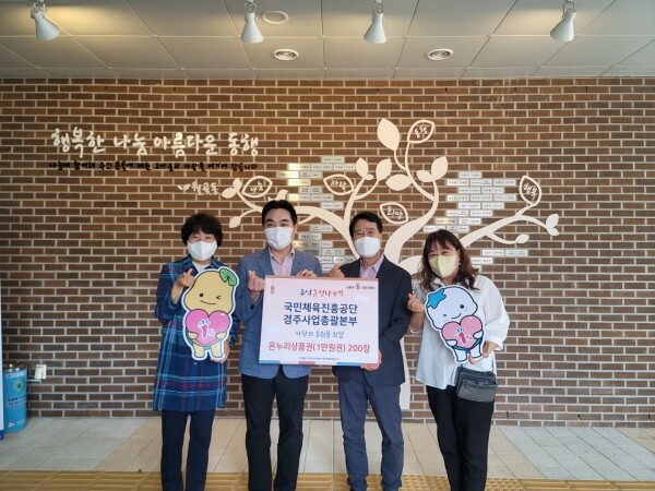 국민체육진흥공단 경주사업총괄본부 시흥지점은 코로나19 확진자 증가에 따라 사업장 운영 일시 중단 및 이용자 감소 등 경영상의 어려움에도 매년 추석마다 후원품 전달의 뜻을 밝혀 나눔 문화 확산에 앞장서고 있다.