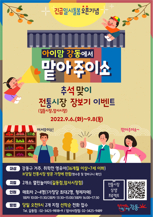 9월 6일부터 8일까지 3일간, ‘아이맘 강동’ 2개소에서는 주부들이 아이를 맡기고 마음 편히 장을 볼 수 있도록 긴급일시돌봄 서비스를 제공한다.