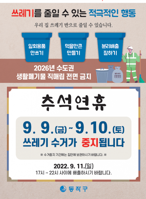 또한, 9월 9일부터 이틀간은 쓰레기 수거가 중지되므로 가정·상가에서 생활·음식물쓰레기, 재활용 등을 보관한 후 11일 오후 5시부터 오후 10시 사이에 배출이 가능하다.