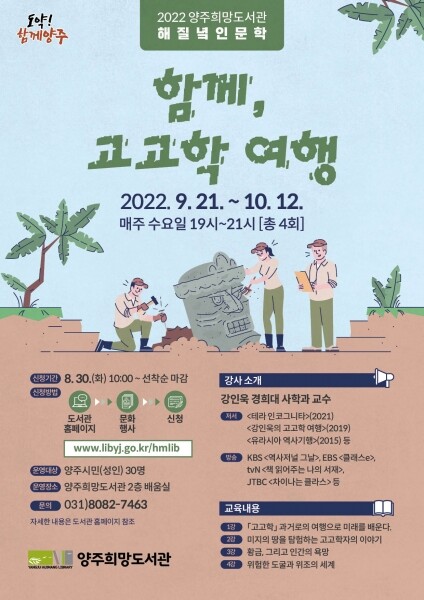 시 도서관 관계자는 “전문가의 강연을 통해 고고학에 대한 관심과 흥미를 갖게 되고 인문학에 대한 즐거움을 느낄 수 있기를 바란다”고 전했다.