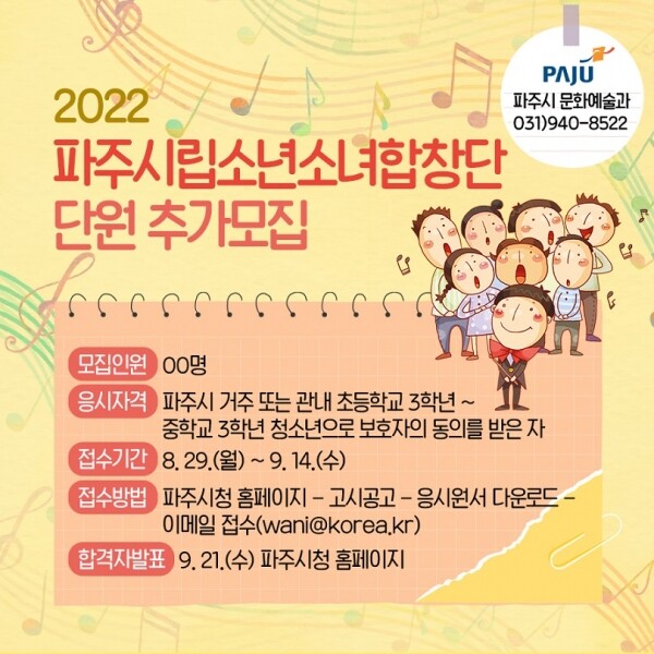 이번 모집은 공고일 기준 파주시에 주민등록이 돼 있거나 관내 학교에 재학 중인 10세~16세의 신입단원으로 보호자의 동의를 받은 자에 한해 모집한다.