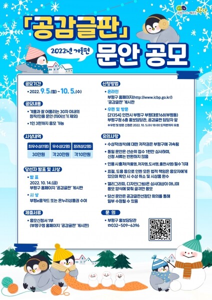 당선작은 겨울에 어울리는 디자인과 함께 오는 12월부터 부평구청사 외벽을 비롯한 지역 내 시설 14곳에 게시된다.