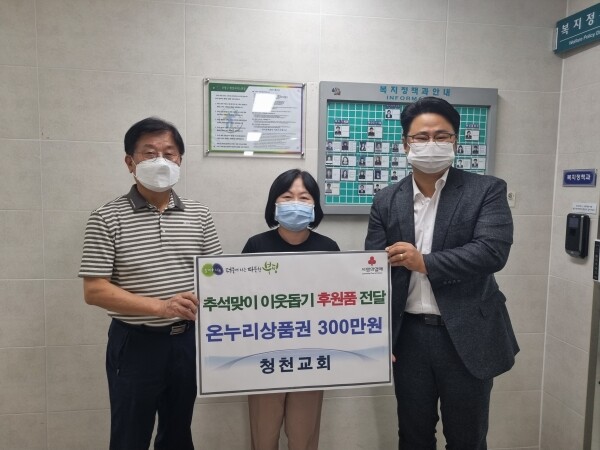 배정훈 청천교회 담임목사는 “코로나19가 장기화되고는 있지만 우리의 이웃들이 즐겁게 명절을 보내길 희망하는 마음으로 성품을 기탁했다”고 말했다.
