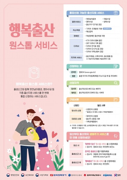 2일 시에 따르면 출산·양육 관련 수혜 서비스 정보를 지원하는 ‘행복 출산 원스톱서비스’에서 고속열차를 이용하는 임산부 및 다자녀 가족이 간편하게 할인 혜택을 이용할 수 있도록 신청 서비스를 추가 제공한다.