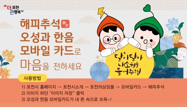 모바일 카드는 새로운 모습의 포천시 캐릭터 ‘번뜩이는 지혜, 오성’과 ‘따뜻한 마음, 한음’을 주인공으로 가족과 지인에게 손쉽게 안부를 전할 수 있도록 추석 인사 문구를 더해 만들었다.