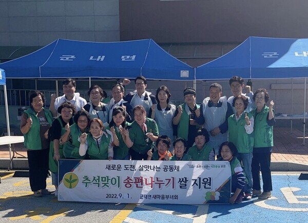 정은숙 군내면 새마을부녀회장은 “송편을 직접 빚고 이웃들과 나눌 수 있는 기회를 마련하게 되어 기쁘게 생각한다 이렇게 송편을 나눠 먹으니 군내면 전체가 마치 한 가족이 된 것 같아 즐겁다 모두 풍성한 한가위 보내셨으면 좋겠다”고 말했다.