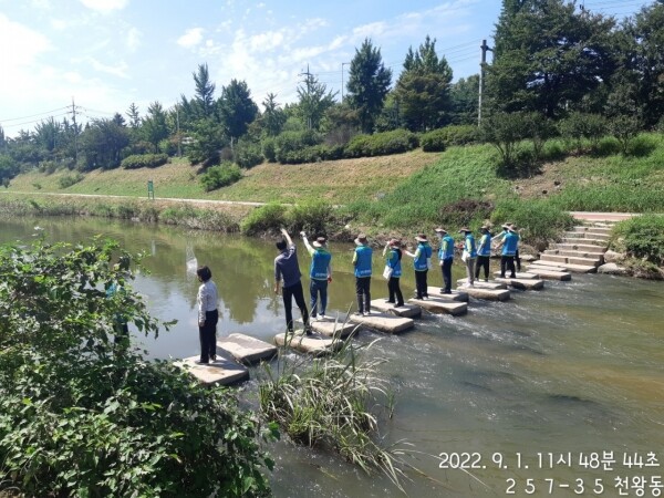지난 9월 1일 목감천 너부대교 일대에서는 광명시 행복마을관리소 지킴이들이 마을자치센터 직원, 산책 나온 주민 등과 함께 수질오염 개선을 위한 EM 흙공 던지기 캠페인을 진행했다.