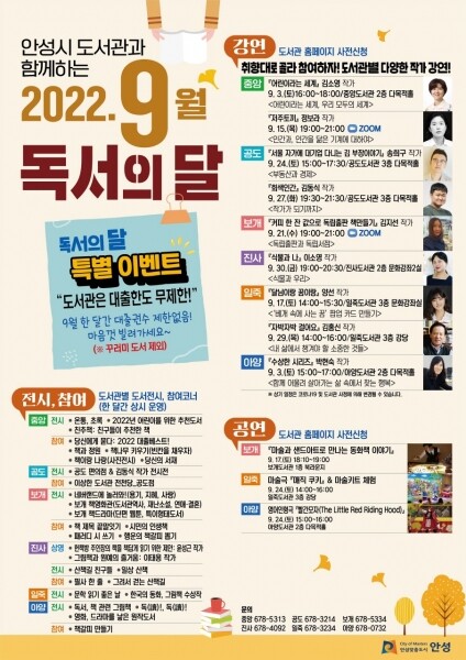 먼저 도서관별 다양한 작가 강연으로는 중앙도서관에서 ‘어린이라는 세계’ 김소영 작가, 2022년 부커상 최종후보 ‘저주토끼’ 정보라 작가의 강연 공도도서관에서 ‘서울 자가에 대기업 다니는 김 부장이야기’ 송희구 작가와 ‘회색인간’ 김동식 작가의 강연 보개도서관에서 ‘커피 한 잔 값으로 독립출판 책만들기’ 김지선 작가의 강연 진사도서관에서 ‘식물과 나’ 이소영 작가의 강연 일죽도서관에서 ‘달님이랑 꿈이랑’ 양선 작가와 ‘자박자박 걸어요’ 김홍신 작가의 강연 아양도서관에서 ‘수상한 시리즈’ 박현숙 작가의 강연이 진행된다.