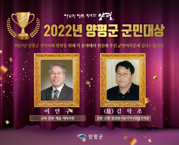 이번에 수상하는 양평군민대상은 지역 발전을 위해 헌신하고 봉사한 군민을 발굴, 선정해 군민의 긍지와 애향심을 드높이고자 드리는 양평군 최고‘영예의 상’으로 교육·문화·예술·체육 부문에는 단일 후보자가 되신 이언구님에 대한 찬반투표를 진행해 과반수 이상의 찬성표로 수상자가 결정됐다.