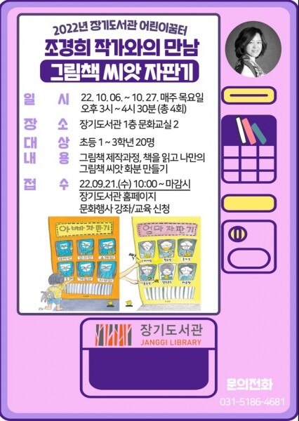 이번 강좌는 베스트셀러 ‘엄마 자판기’, ‘아빠 자판기’ 의 저자 조경희 그림책 작가와 함께 그림책 제작과정을 알아보고 일상생활에서의 다양한 경험과 가족에 대한 이야기를 그림책 씨앗 화분으로 표현해 그림책 작가가 되어보는 독후활동으로 진행할 예정이다.