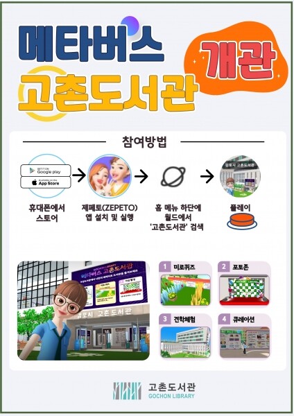 ‘메타버스 고촌도서관’은 김포시 고촌읍에 위치한 고촌도서관 건물을 가상공간에 실제 도서관과 유사하게 만든 도서관으로 휴대폰에 제페토 앱을 설치하고 회원가입 후 월드에서 ‘김포시 고촌도서관’을 검색하면 가상도서관을 체험할 수 있다.