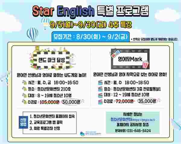 9월 5일부터 30일까지 4주간 청소년들이 관심 있어 하는 다양한 활동을 통해 영어를 배울 수 있도록 특별 프로그램을 운영할 예정이며 모집기간은 8월 30일부터 9월 3일까지이다.