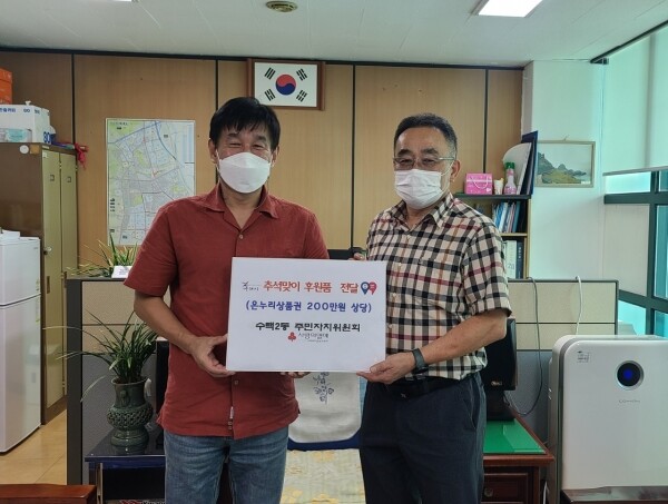 올해 수택2동 행정복지센터 맞춤형복지팀에 전달한 온누리상품권은 관내 거주 저소득 가구 중 40가구를 선정해 추석 전에 지급할 예정이다.