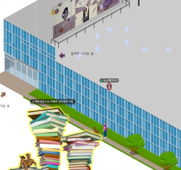 메타버스 플랫폼인 게더타운을 활용해 책이 있는 자료열람실 현장을 중심으로 실제 도서관 모습을 그대로 담았다.