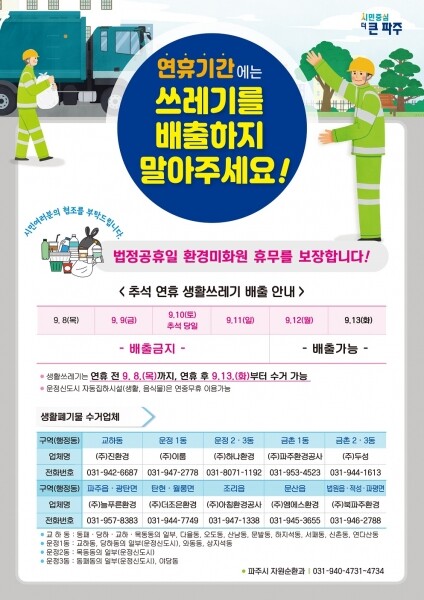 박준태 자원순환과장은 “추석 연휴 기간 쓰레기 수거 중단으로 시민 여러분께서 불편하시겠지만 환경미화원이 가족과 명절을 보낼 수 있도록 배려의 마음으로 적극적인 참여를 부탁드린다“고 말했다.