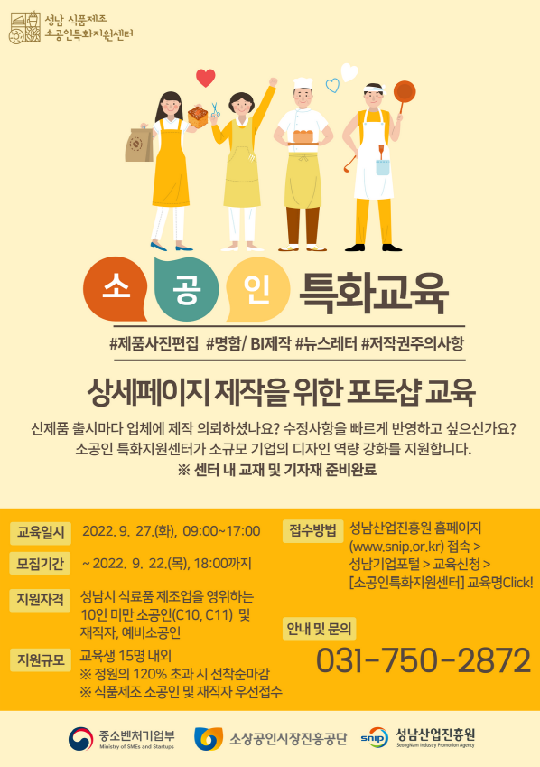 소공인들의 디자인 역량 강화를 위해 진행되는 이번 소공인 특화교육은 오는 9월 27일 9시부터 오후 5시까지 진행되며 제품 홍보 포스터 제작, 오픈마켓 상세페이지 디자인, SNS 홍보용 페이지 구성 등 식음료 상세페이지 제작을 위한 포토샵 교육이 이뤄질 예정이다.