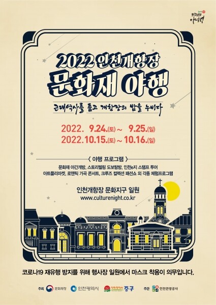 문화재청, 인천시, 인천 중구가 주최하고 인천관광공사가 주관하는 인천개항장 문화재 야행은 올해 7회째 맞이하며 ‘근대역사를 품고 개항장의 밤을 누비다’를 부제로 지역사회와 연계한 다양한 문화행사를 선보인다.