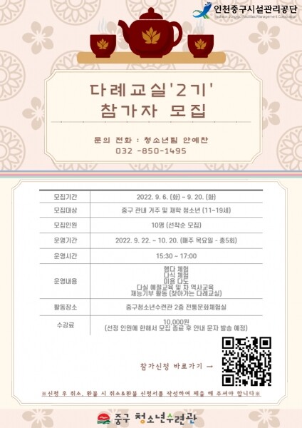 관내 청소년 10명을 선착순으로 추가 모집하며 다례, 행다, 다식체험, 미용다도, 차 역사교육, 재능기부활동 등의 활동을 하게 된다.