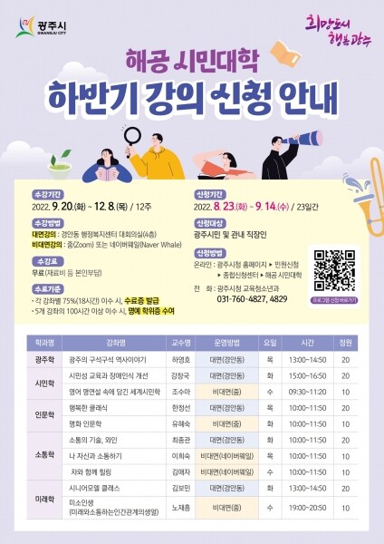 시 관계자는 “시민학부터 인문학, 소통학, 미래학, 광주학 등 다양한 강좌로 평생학습을 즐기고 배움의 가치를 실현할 수 있기를 바란다”고 말했다.