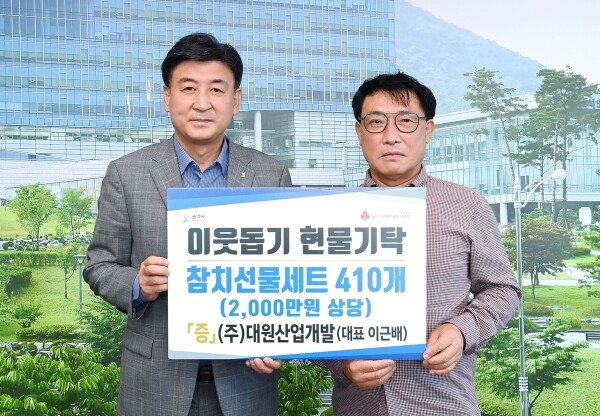 지난 2일 ㈜대원산업개발 이근배 대표가 참치선물세트 410개, ㈜팩플러스 1천만원, NH농협은행 백미 300포를 기탁했다.