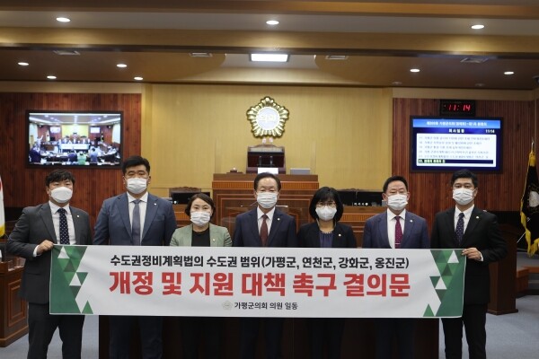 한편 본회의 안건 제안설명에 앞서 강민숙 의원은 소상공인 지원대책과 재난지원금 지급 관련 향후 계획에 대한 5분 발언을 했고 가평군의회에서는‘수도권정비계획법’의 수도권 지정으로 인해 지역발전을 가로막고 인구 위기를 심화시키고 있는 현실을 개선할 것을 강력하게 요청하기 위해‘수도권정비계획법의 수도권 범위 개정 및 지원 대책 촉구 결의문’을 채택했다.