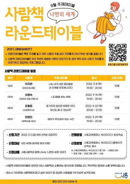9월‘사람책 라운드테이블’에 참여하고 싶은 시민은 9월 2일부터 시흥교육캠퍼스 쏙 사람도서관 홈페이지 또는 도서관 홈페이지를 통해 신청하면 된다.