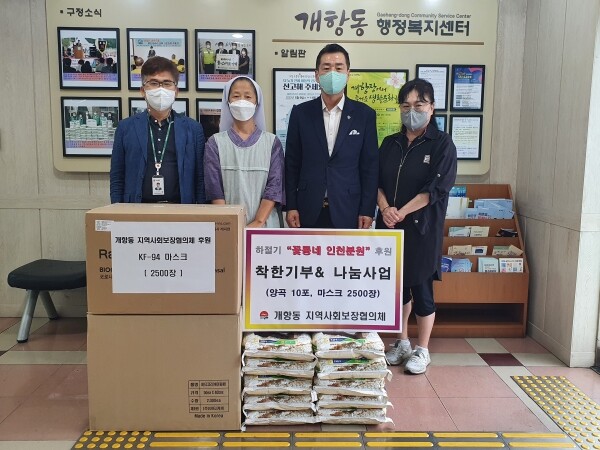 이날 개항동 지역사회보장협의체는 노숙인, 저소득 취약계층 등 무료급식소 이용자들의 코로나19 예방을 위해 KF-94 마스크 2500장을 준비했다.