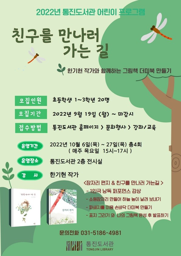 접수는 9월 19일 9시부터 통진도서관 홈페이지 문화행사에서 가능하며 선착순 20명을 모집한다.