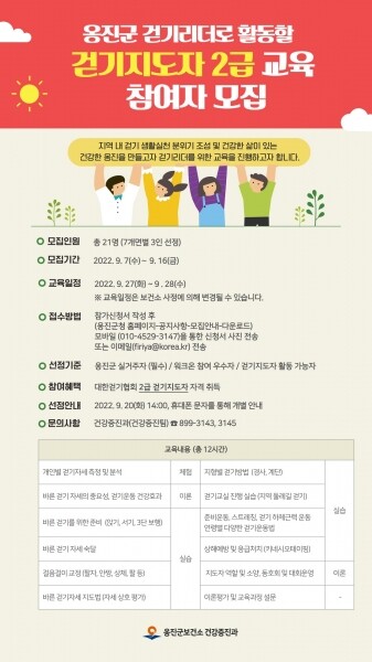 걷기지도자 자격취득 교육은 옹진군민들의 걷기 실천율이 35.9%로 인천시 45.6%와 비교해 상대적으로 낮아 올바른 걷기 방법 공유와 문화 확산으로 군민의 걷기 실천율을 향상하기 위해 마련됐다.