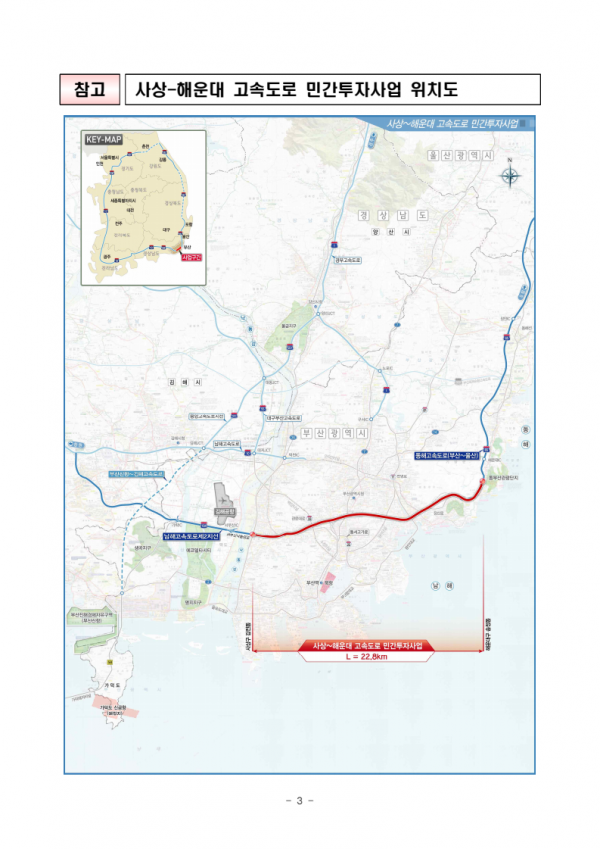 사상-해운대 고속도로는 부산 서부의 남해고속도로 제2지선과 동부의 동해고속도로를 연결하는 22.8km의 사업으로 그간 고속도로 단절로 인해 부산시 도심을 통과해야 했던 차량들이지하도로를 이용할 수 있게 되어 부산 도심지 지·정체가 완화될 것으로기대된다.