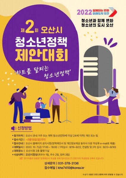 오산시에 거주하는 만9~24세 청소년 개인 또는 팀이면 누구나 참여할 수 있으며 오산시 홈페이지를 통해 관련 서류와 제안서를 작성해 제출하면 된다.