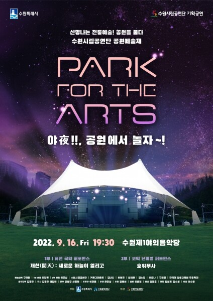수원시립공연단 기획공연 공원예술제 ‘Park For The Arts 야夜, 공원에서 놀자~’는 9월 16일 금요일 수원제1야외음악당에서 펼쳐진다.