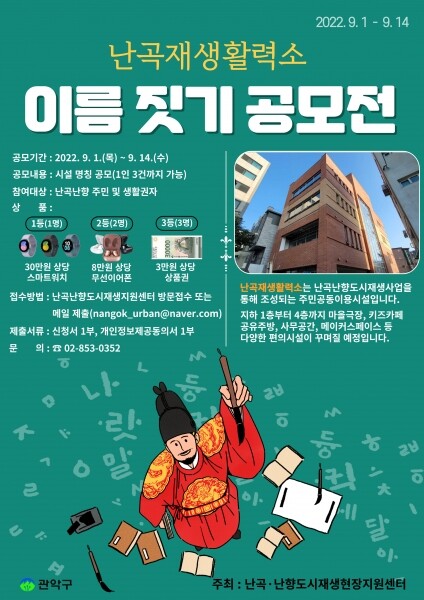 구는 이번 명칭 공모를 통해 주민공동 이용시설인 ‘난곡재생활력소’ 가 주민이 모여 지역의 활력을 불어넣는 커뮤니티 공간으로서의 취지를 되새겨 주민이 직접 제안한 참신하고 친근한 명칭을 찾고자 한다.