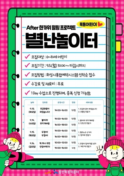 화성시인재육성재단 김태호 대표이사는 “이번 추석 후 힐링 프로젝트를 통해 동탄목동이음터에서 온 가족이 함께 다채로운 체험을 즐기길 바란다”고 말했다.