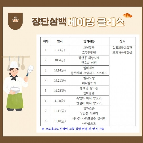 본 교육은 아뜰리에 마카롱의 권미성 대표를 초빙해 진행될 예정이며 교육을 통해 웰빙 쌀빵에 대한 이해와 파주농산물의 우수성을 알리고자 하며 강의내용은 쌀시오빵과 장단콩 휘낭시에, 머핀, 쌀바게트, 쌀스콘, 맘모스 등 다양한 메뉴로 구성돼 있다.