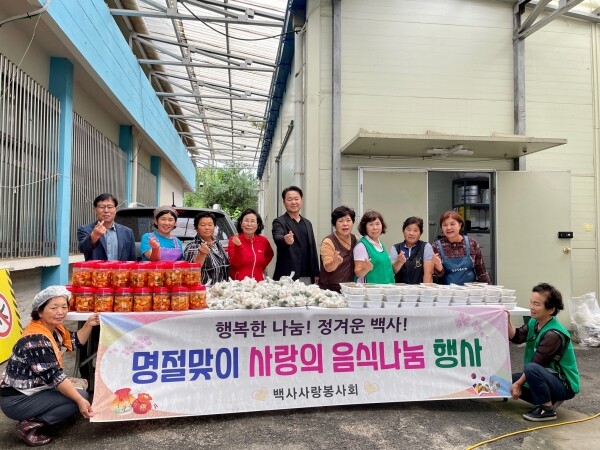 손기범 백사면장은 “민족 대명절 추석을 맞아 명절음식을 만들어 필요한 가정에 전달에 헌신해주신 백사사랑봉사회에 감사드린다”며 “백사면도 도움이 필요한 분들에게 최선을 다해 도움을 드려, 살기 좋은 백사가 되도록 노력하겠다”고 말했다.