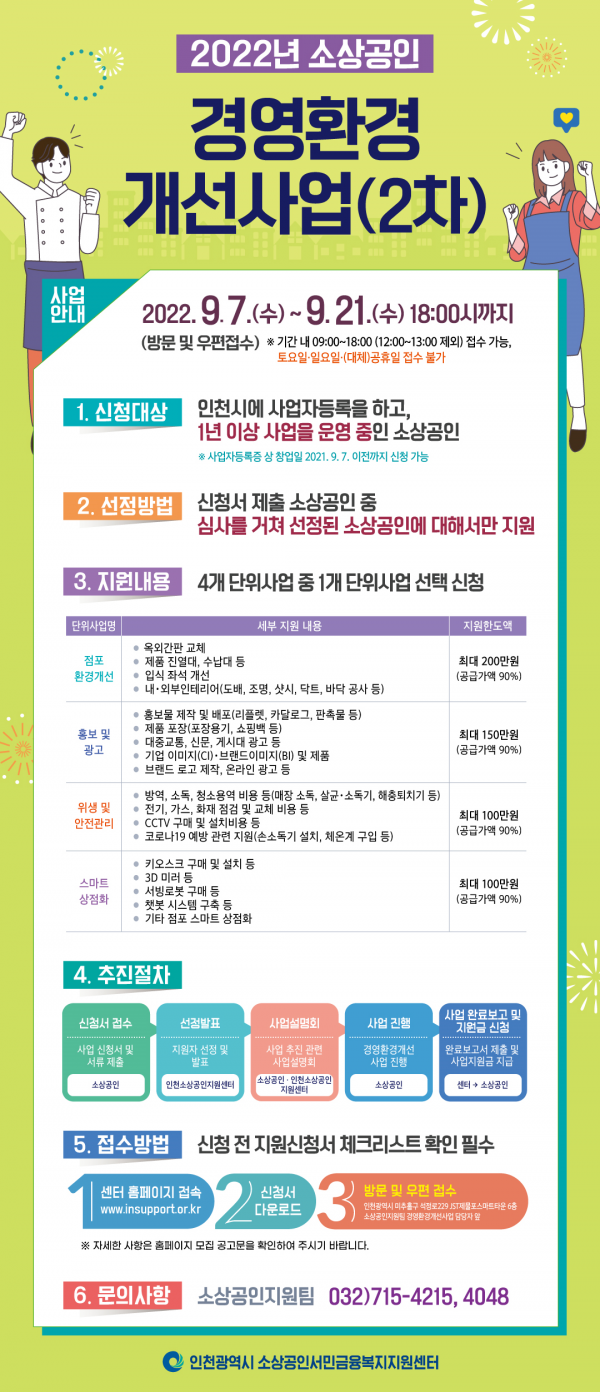지난 5월, 1차 경영환경개선사업을 통해 90개 업체를 지원한데 이어 이번 2차 사업을 통해 100개 업체의 소상공인을 추가 지원한다는 방침이다.