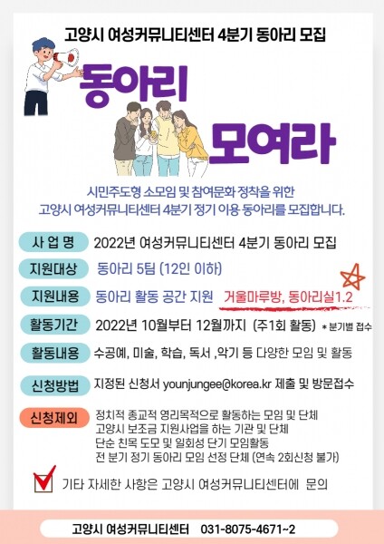 고양시민 누구나 이용할 수 있는 동아리 및 소모임 활동공간으로 회의, 토론, 수공예, 미술, 신체활동 등 다양한 활동을 할 수 있는 시설이 갖춰져 있다.