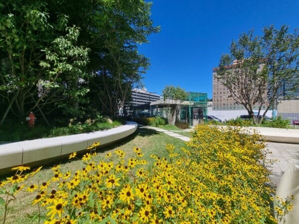 사옥 지하주차장 상부에 특색 있는 초화류를 심고 나무데크로 보행 편의를 높인 ‘하늘정원’은 중학천 도시숲의 백미다.