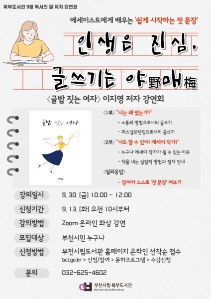 모집 인원은 50명이며 접수는 9월 13일 화요일 오전 10시부터 부천시립도서관 홈페이지를 통해 신청하면 된다.