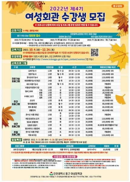 수강생 모집은 인터넷 접수로 진행되며 동구 주민 우선 접수는 9월 13일부터 9월 16일까지 동구 주민을 포함한 인천시민 접수는 9월 19일부터 9월 23일까지이며 추가접수 기간은 9월 26일부터 10월 7일까지이다.