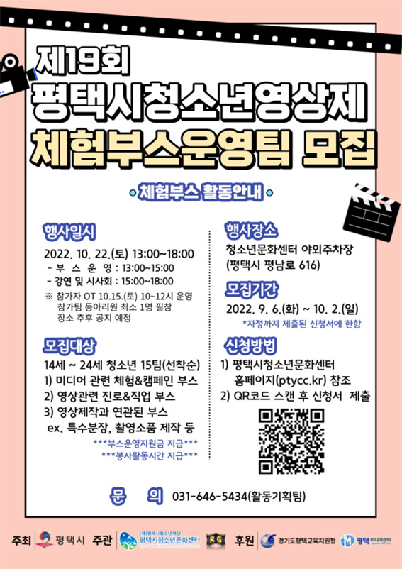 부스 운영 참가 신청은 평택시청소년문화센터 누리집 공지사항에 게시된 링크 접속 또는 포스터를 참조해 QR 코드 스캔 후 작성 및 제출하면 된다.
