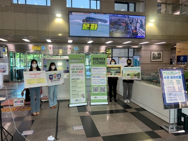 캠페인은 구청 직원 및 주민을 대상으로 아동학대예방과 인식 확립을 위해 홍보 배너를 설치하고 리플릿을 배부하는 형태로 실시됐다.