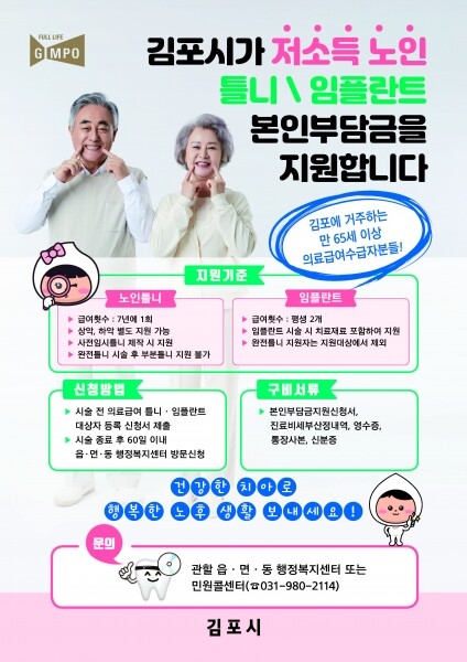 김포시는 이번 사업을 통해 시술 종료 후 발생하는 본인부담금을 지원해 노인 의료급여 수급자의 구강 건강 증진을 도모하고 경제적 부담을 완화하고자 한다.