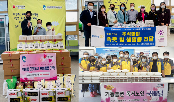 같은 날 국제로타리3750지구 오산백합로타리클럽이 오산시 초평동에 소외계층에 전해달라며 세면도구 등 다양한 생필품이 담긴 선물세트 100개와 후원받은 반찬 2종 20인분을 기탁했다.