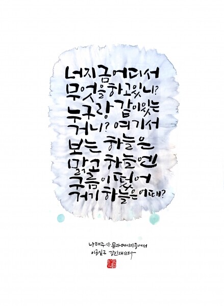 ‘어머님의 손맛’, ‘작은 새싹과 별에 관한 그리움’, ‘봄은 가을, 겨울에 더 그리운 것처럼.’, ‘너 지금 어디서 무엇을 하고 있니?’ 등 일상에서 느낄 수 있는 소소한 감정들을 깊은 맛과 멋을 통해 은은하게 번지는 글씨로 표현해 주민들에게 따스한 안식과 위로의 메시지를 전한다.