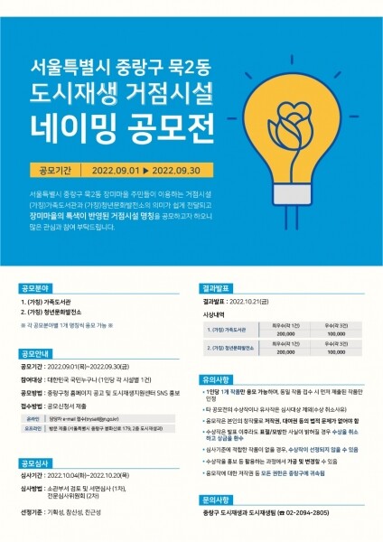 류경기 중랑구청장은 “두 곳의 거점시설은 부족했던 주민들의 여가공간을 확충하고 지역 경제 활성화의 마중물이 될 의미 깊은 공간들”이라며 “시설들이 가지는 의미를 잘 담은 참신한 명칭을 많이 공모해 주시길 바란다”고 말했다.