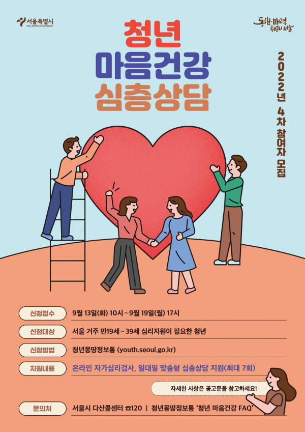 서울시 청년 마음건강 지원사업은 마음건강 관리의 필요성을 인지해 상담을 받고 싶지만, 비용 부담과 심층 상담에 대한 막연한 두려움을 가진 청년들에게 무료로 심층상담 서비스를 제공하는 사업이다.
